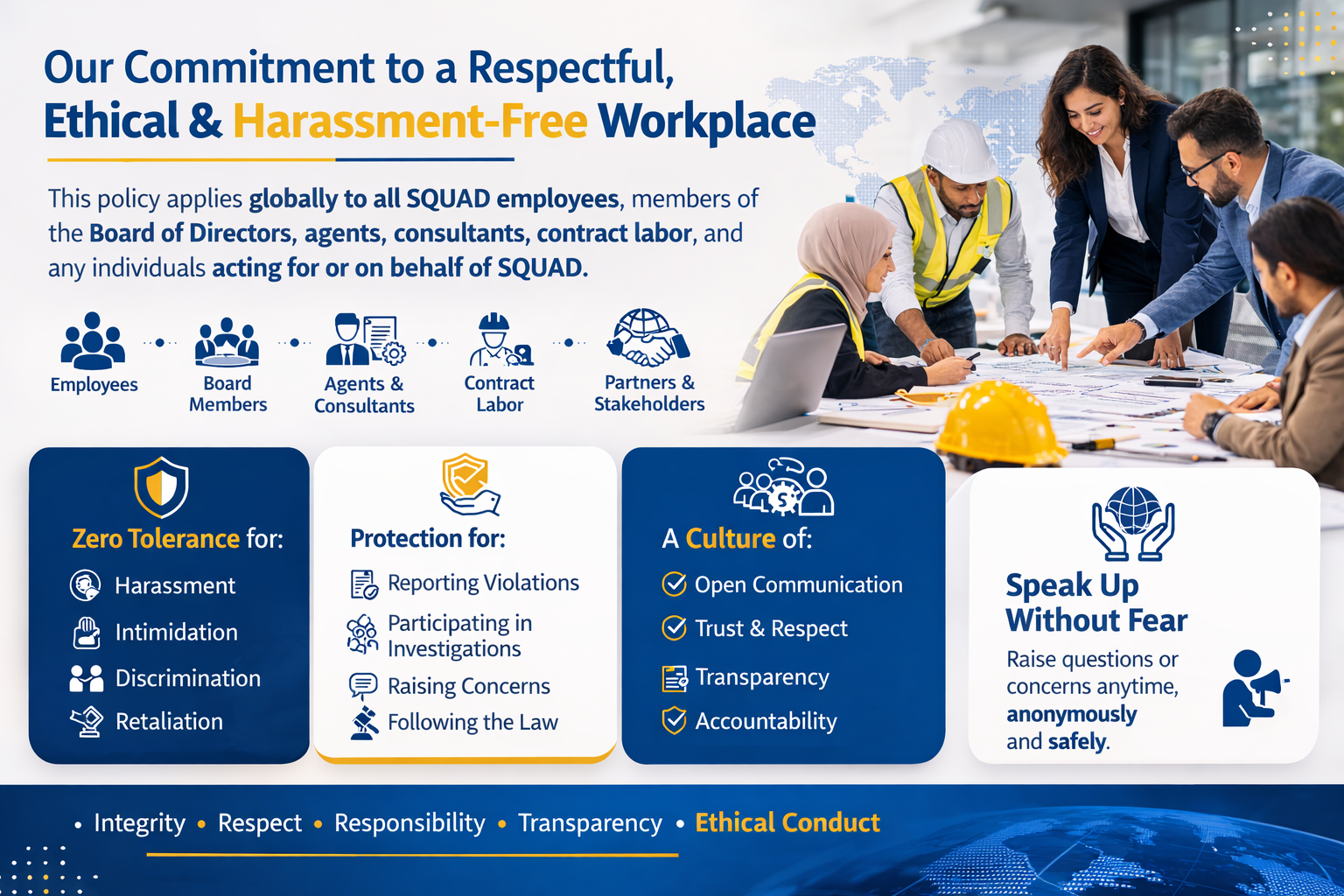 SQUAD is committed to maintaining a professional work environment that is free from harassment, intimidation, discrimination, and retaliation. This includes protection for individuals who engage in lawful and protected activities such as reporting potential violations or participating in investigations related to breaches of laws, the Code of Conduct, or company policies and procedures.